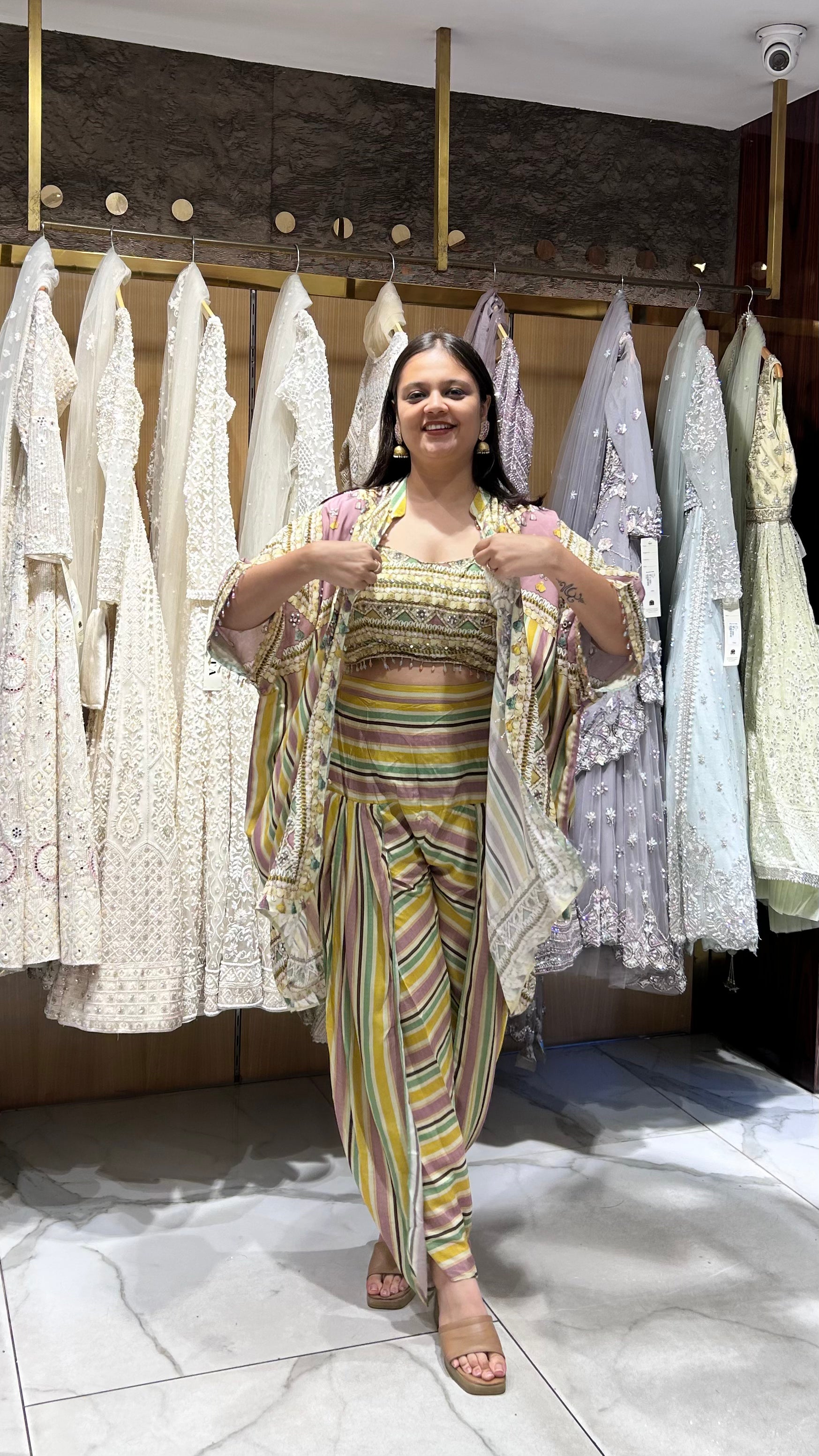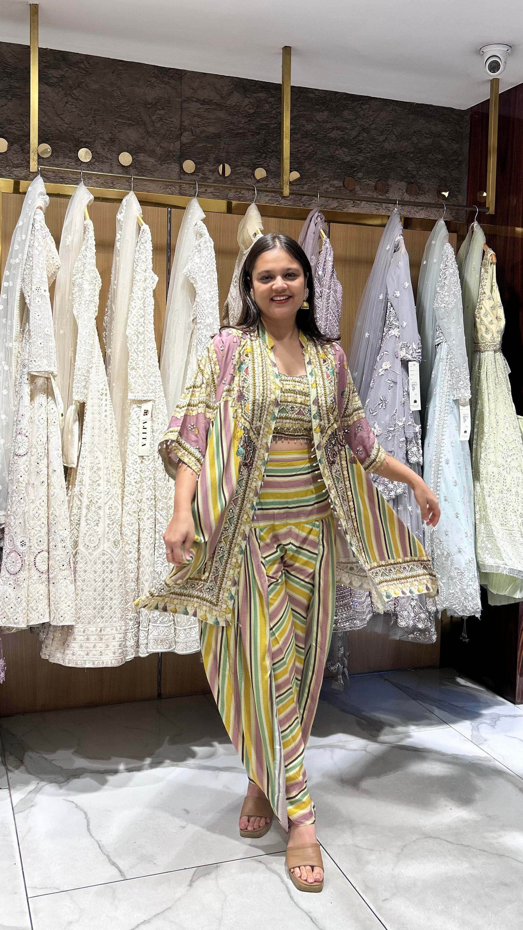 Vibrant and effortlessly chic, the Anvika Indo-Western Set from House of Ajita blends festive colors with modern silhouettes. This multicoloured digital-printed ensemble features a beautifully embroidered blouse and dhoti-style pants, paired with a statement jacket detailed with pearls, golden sequins, and mirror highlights. The four-side hangings and intricate craftsmanship add a playful yet luxurious touch — perfect for haldi, mehendi, carnivals, sundowners, and trousseau looks.