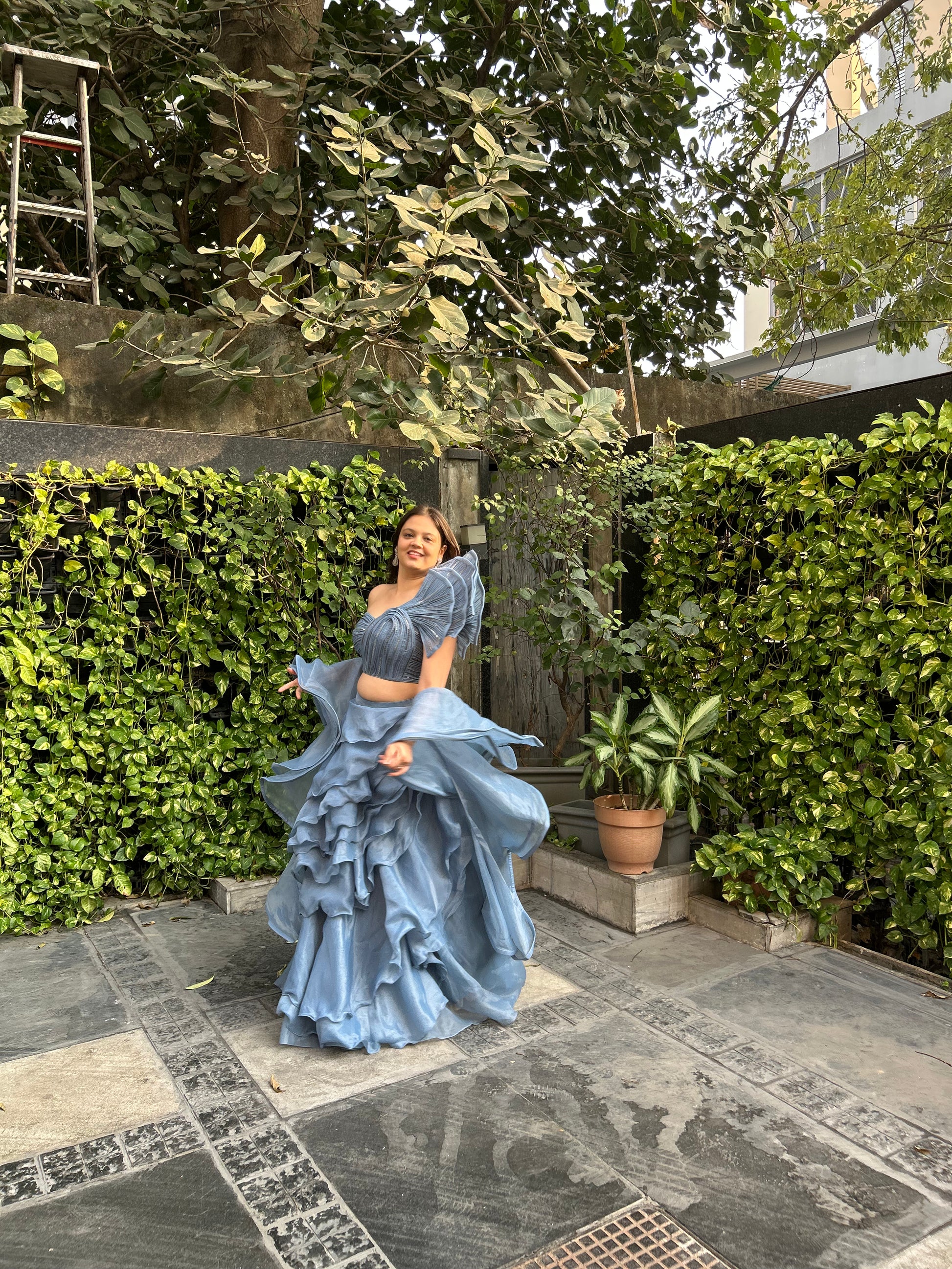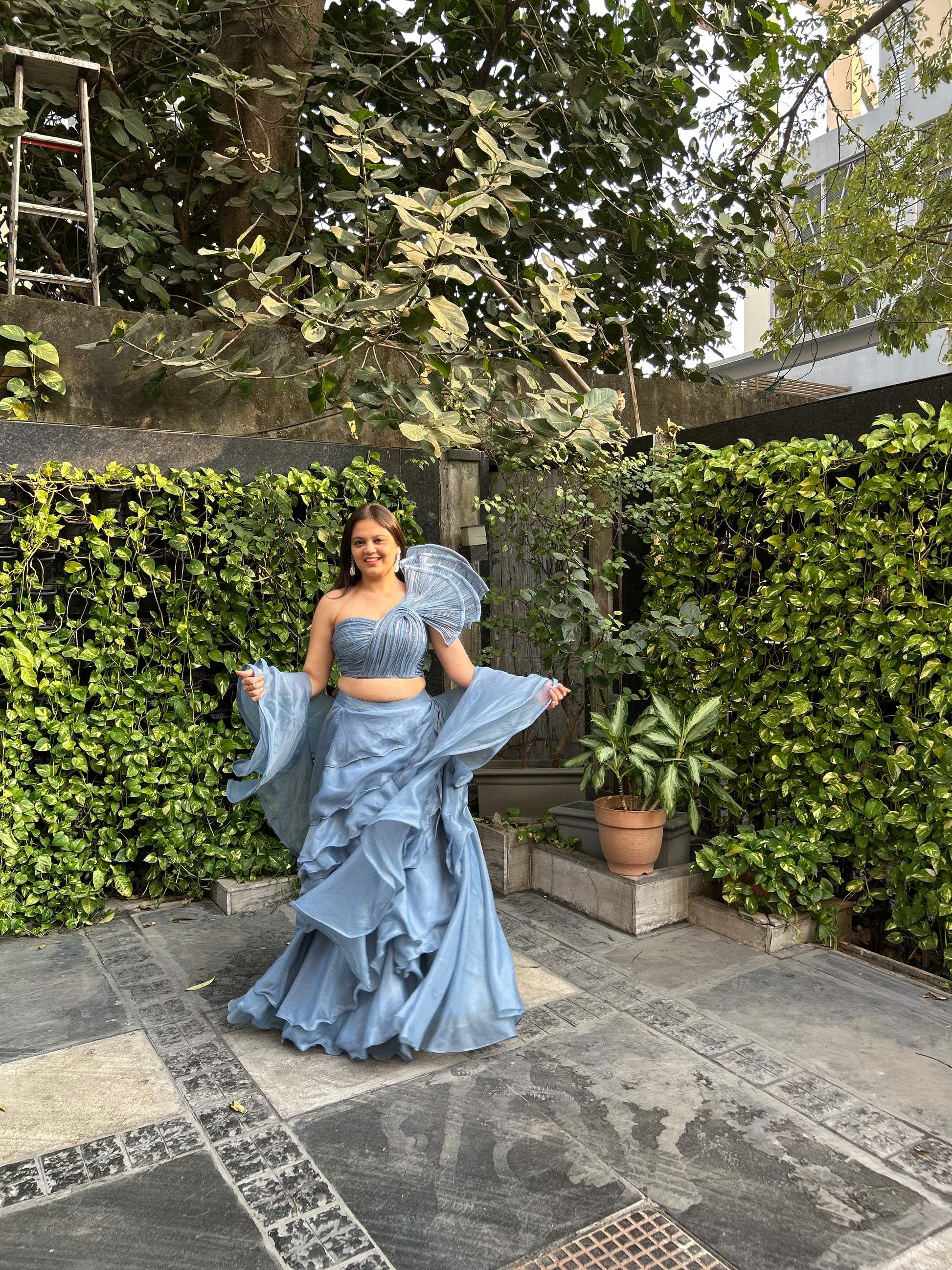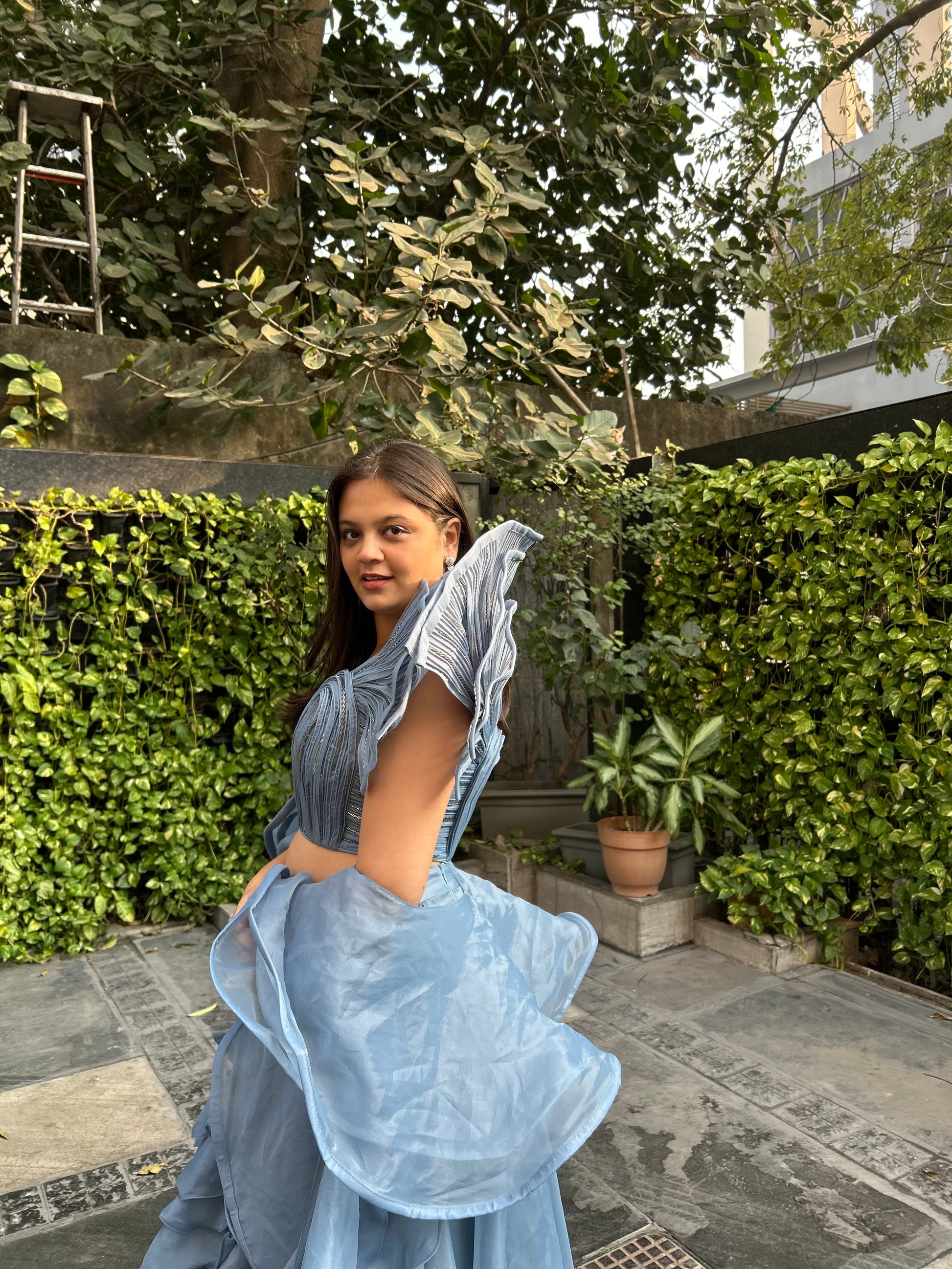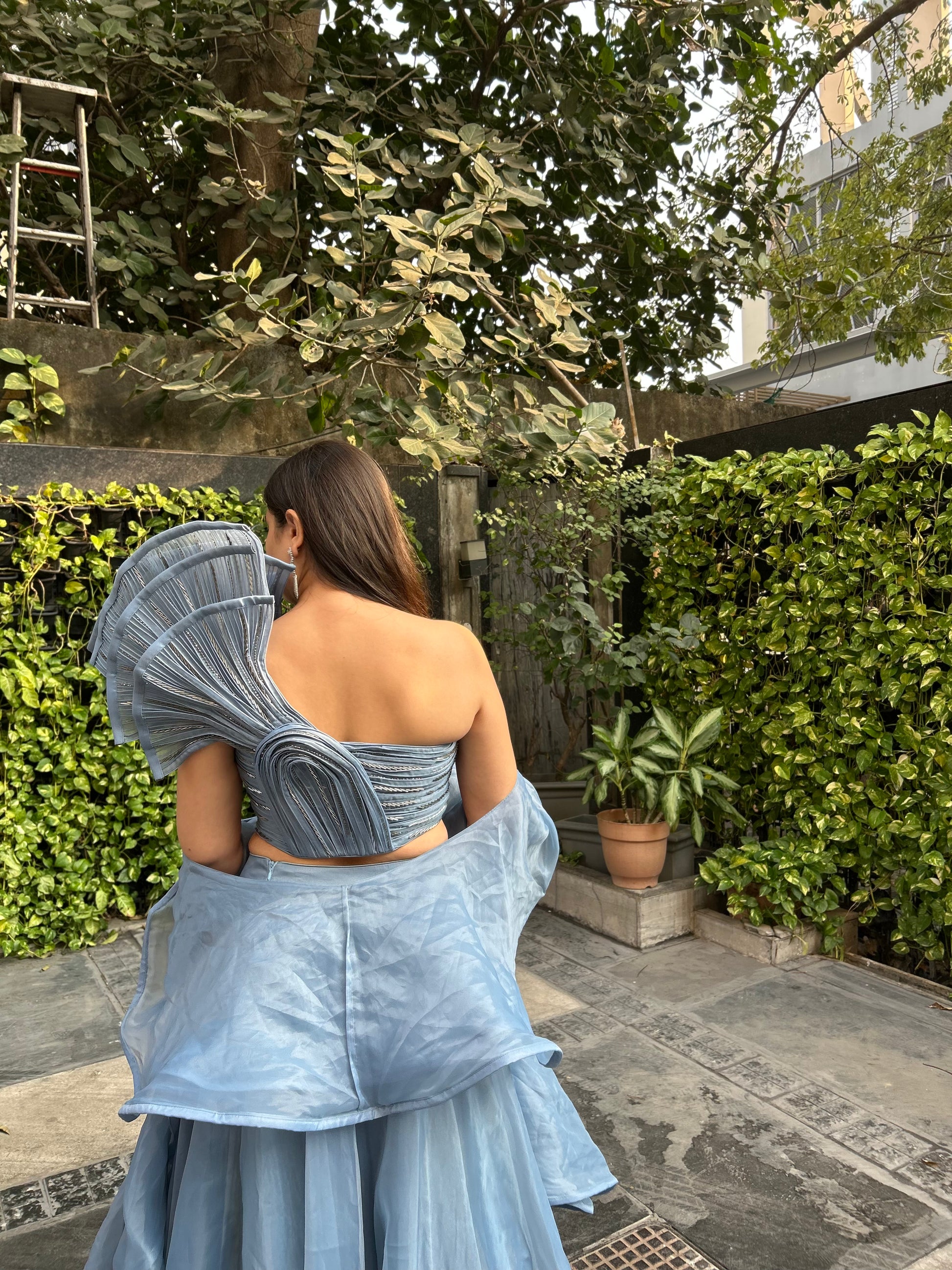 Bella – Designer Inspired Lehenga with Frills & One-Shoulder Blouse (Sleeve option available)