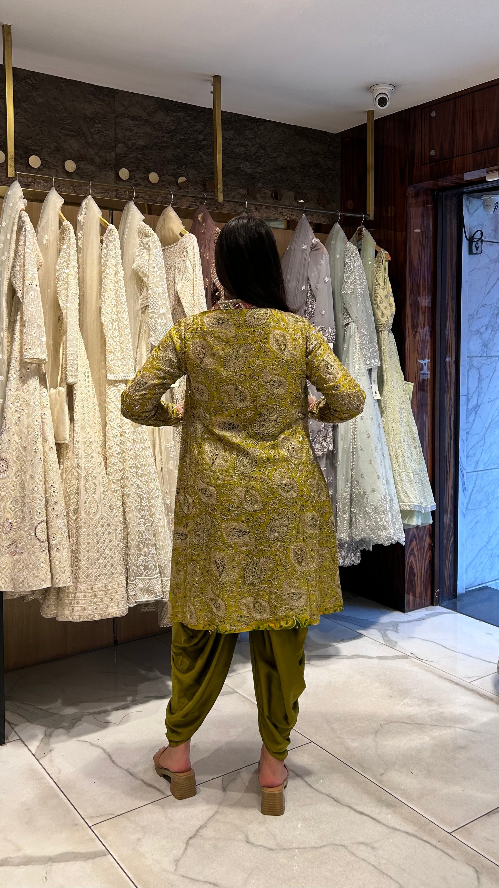 #Ojasvi #HouseOfAjita #IndoWesternSet #MehendiOutfit #HaldiLook #DhotiPants #CrepeSet #ZariEmbroidery #MirrorWork #PearlWork #AjitaKolkata #WeddingReady #FusionWear