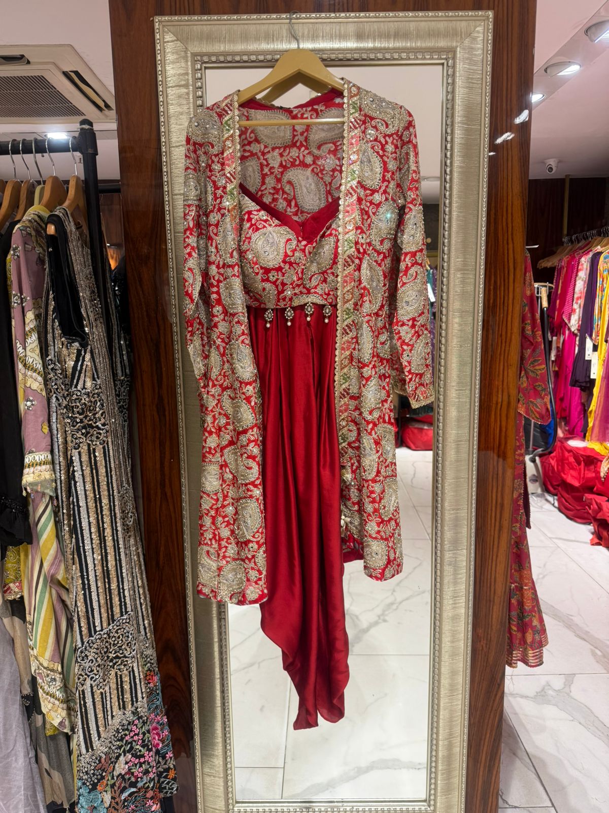Ojasvi – Mehendi Green & Red Embroidered Indo-Western Set with Dhoti Pants and Jacket