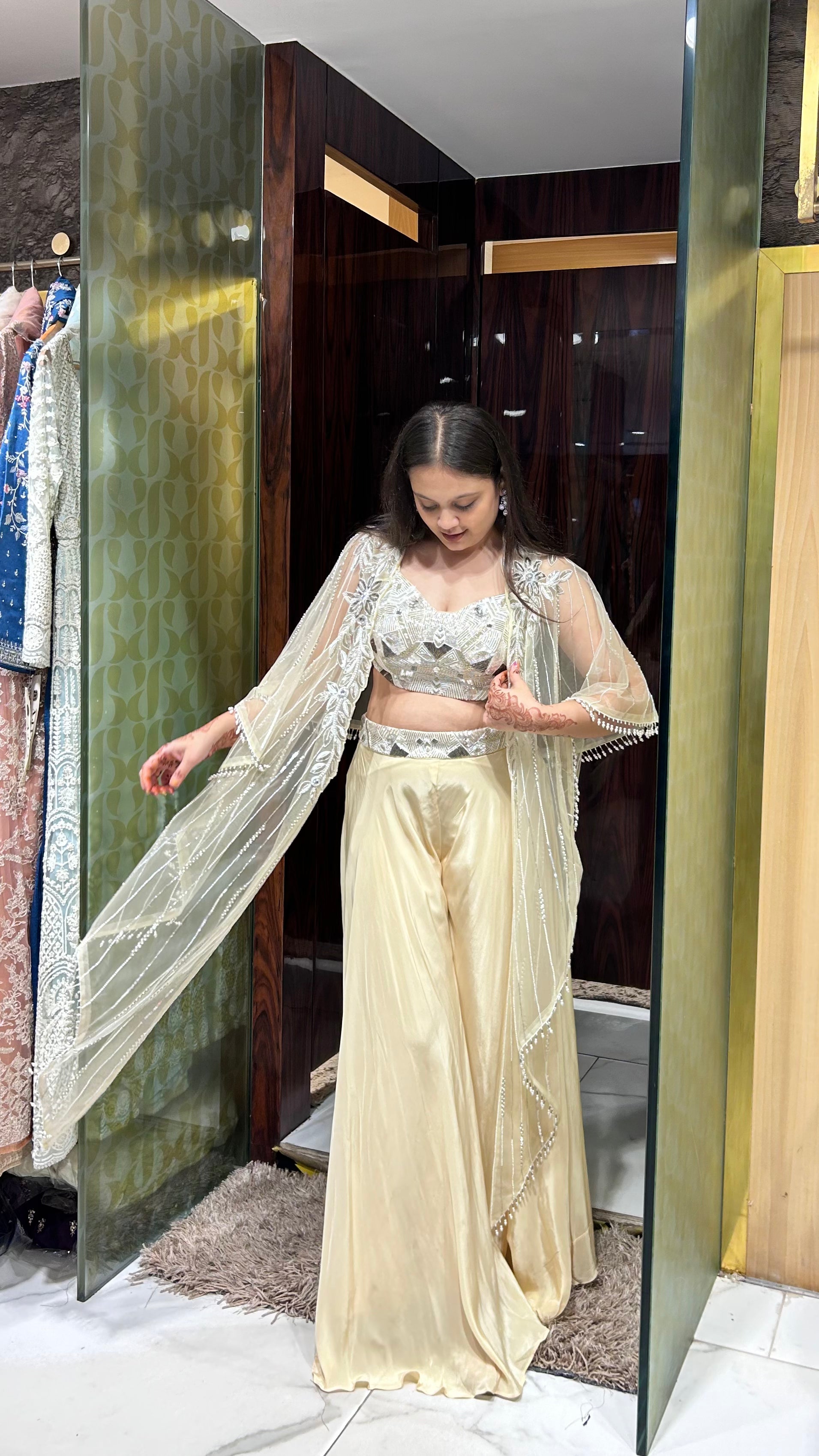 - Fabric: Silk blouse, crepe palazzo pants, net cape