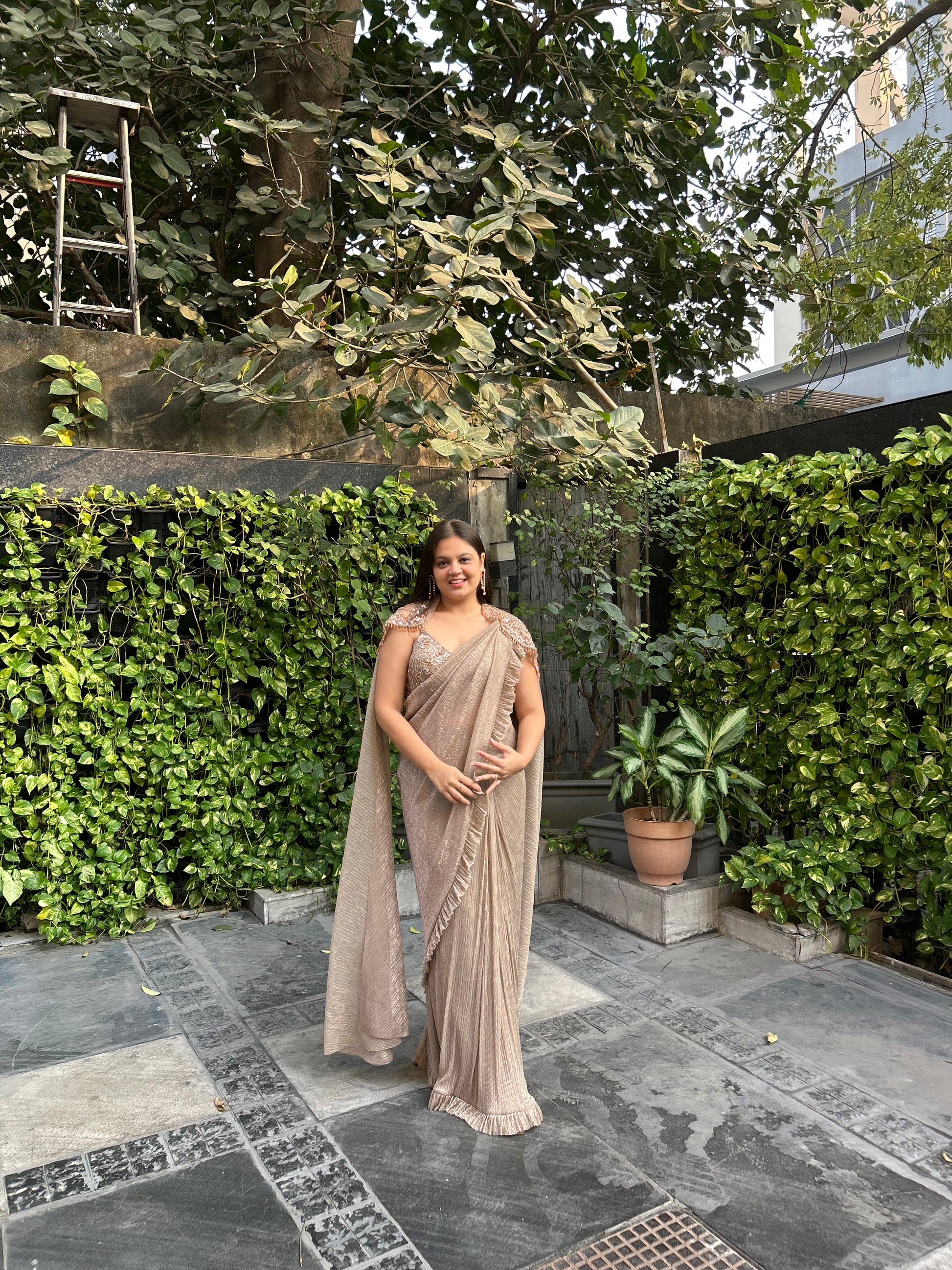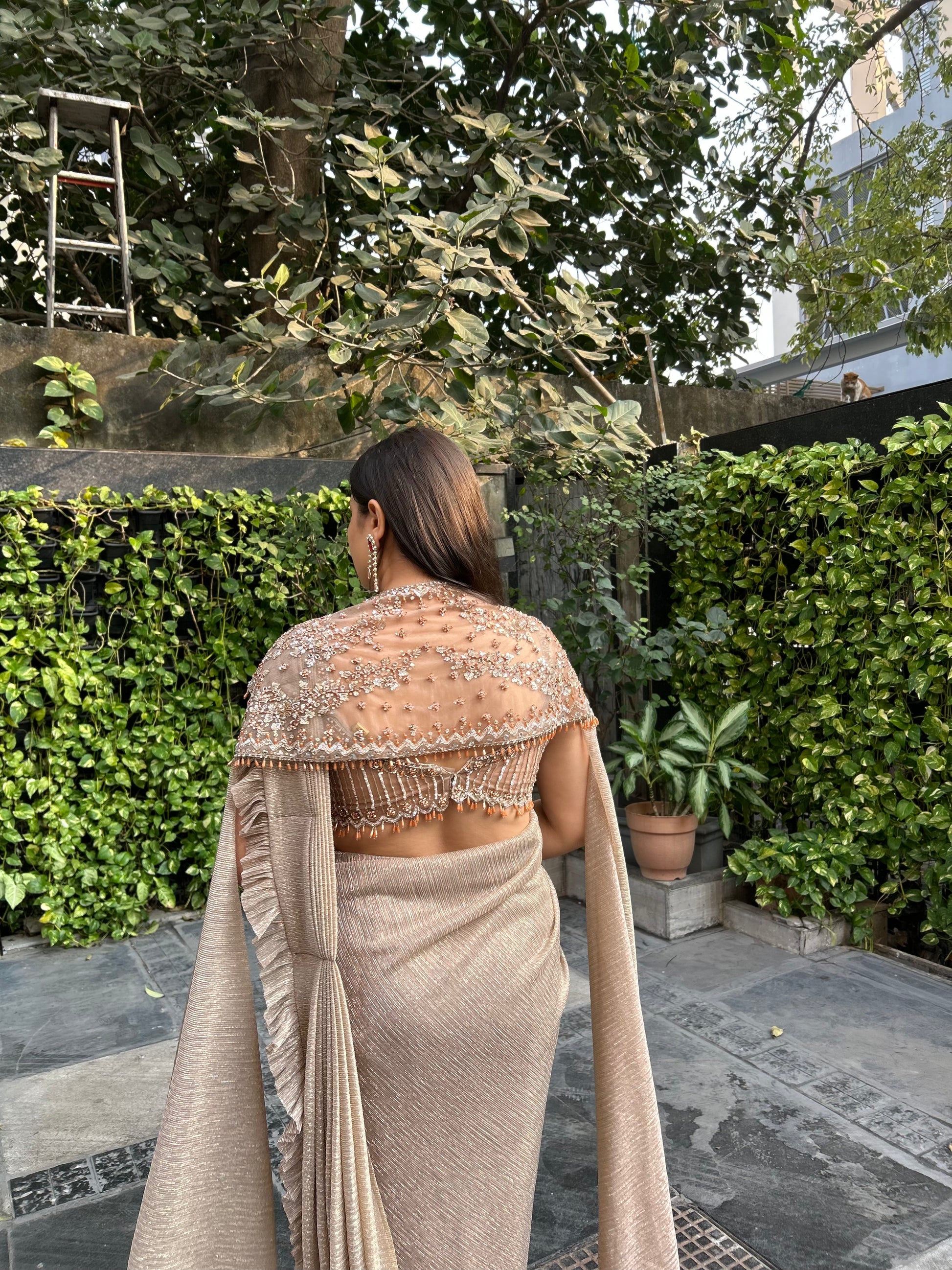 Qiana – Gold Beige Luxe Shimmery Pre-Stitched Saree with Cape