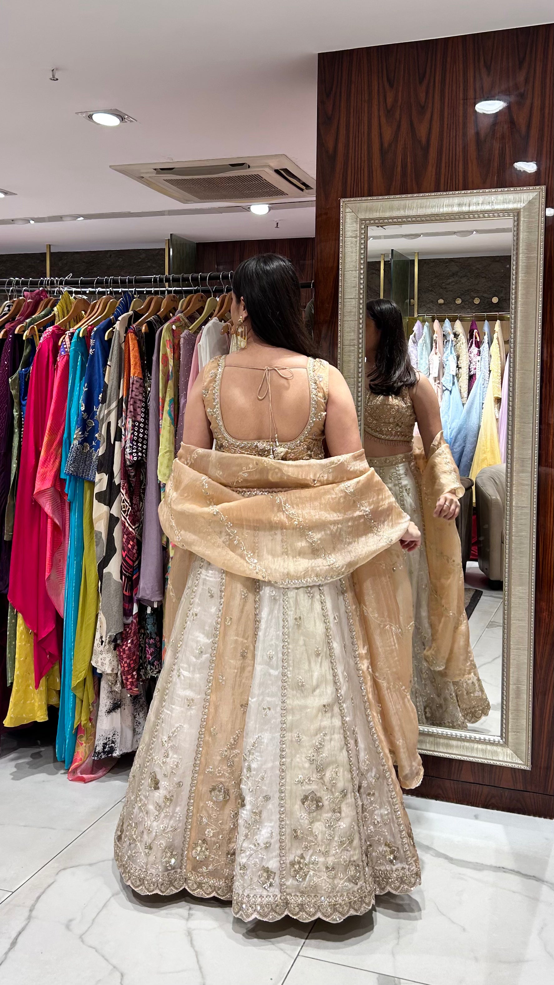 Step into luxury with Reina, a timeless beige-gold tissue lehenga that celebrates elegance in every stitch. This masterpiece features hand-embroidered golden zari and sequin work, crafted across shaded kalis — each in a different tone of gold for a subtle ombré effect. The heavy embroidered blouse and dupatta, finished with rainbow sequins and scalloped borders, add an ethereal radiance. Ideal for brides, engagements, receptions, or the mother/sister of the bride, Reina embodies opulence, grace, and the latest couture-inspired trend.