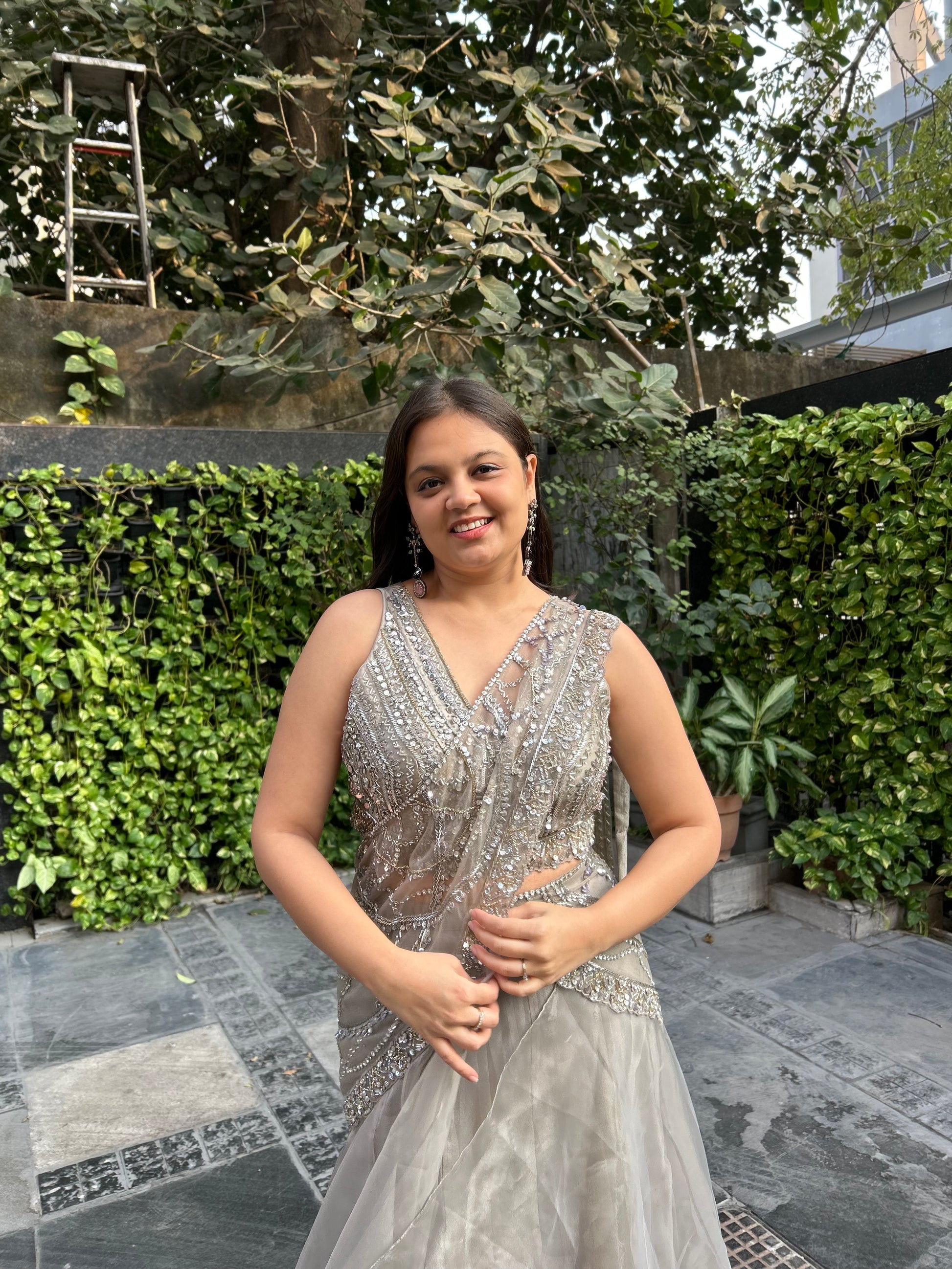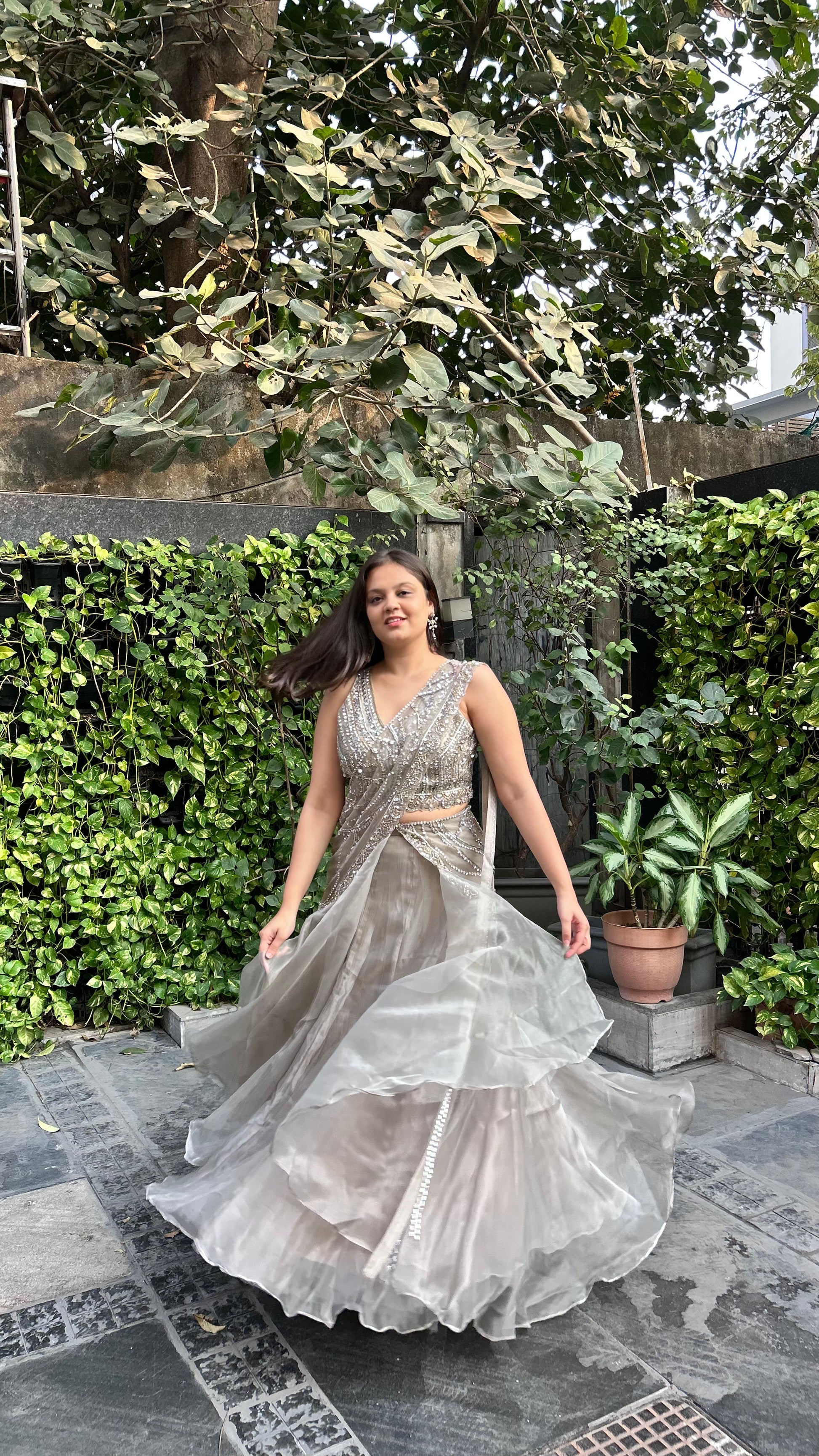 Shayna – Grey Luxe Tissue Drape Saree Lehenga