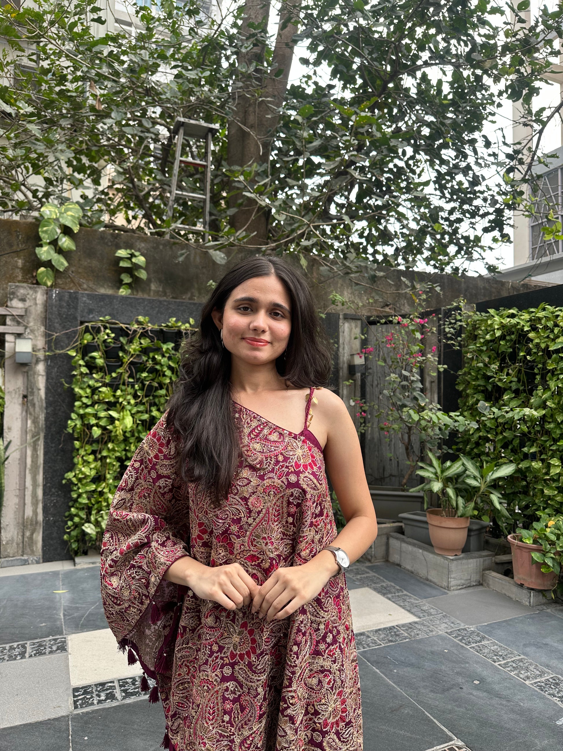 A stylish wine-toned Indo-western ensemble featuring a structured bustier layered with an anti-fit one-shoulder top and palazzo pants. The fluid silhouette with delicate embroidery and playful hangings creates a perfect blend of comfort and festive elegance.