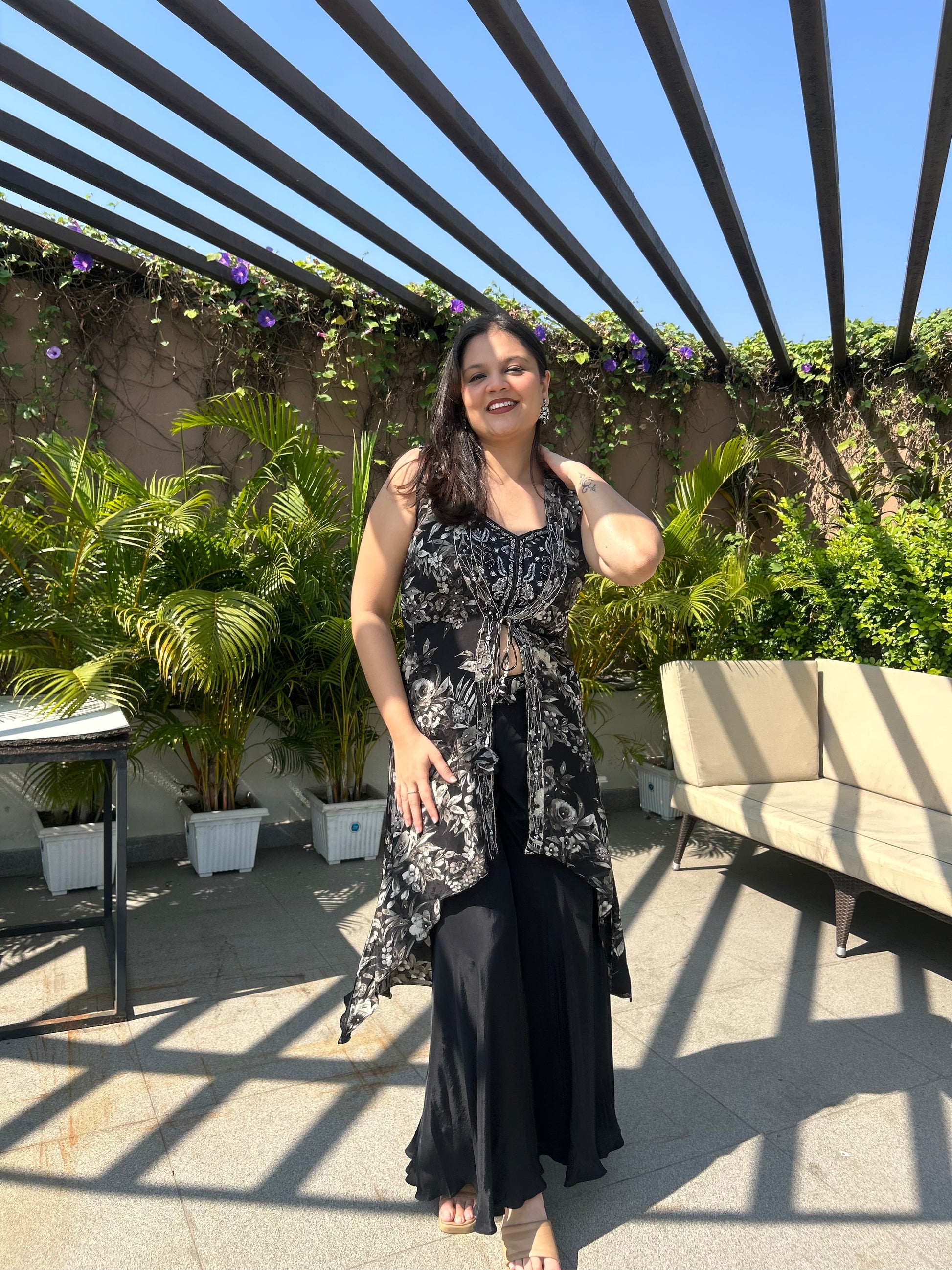 Zaika is a stunning black-and-white Indo-western set featuring a printed and embroidered blouse, a flowing floral printed cape, and solid flared palazzo pants. With rainbow cutdana, pearls and sequins on the blouse, plus stone-and-cutdana highlighted cape detailing, this look is perfect for sufi nights, musical evenings and classy dinner & drinks vibes.